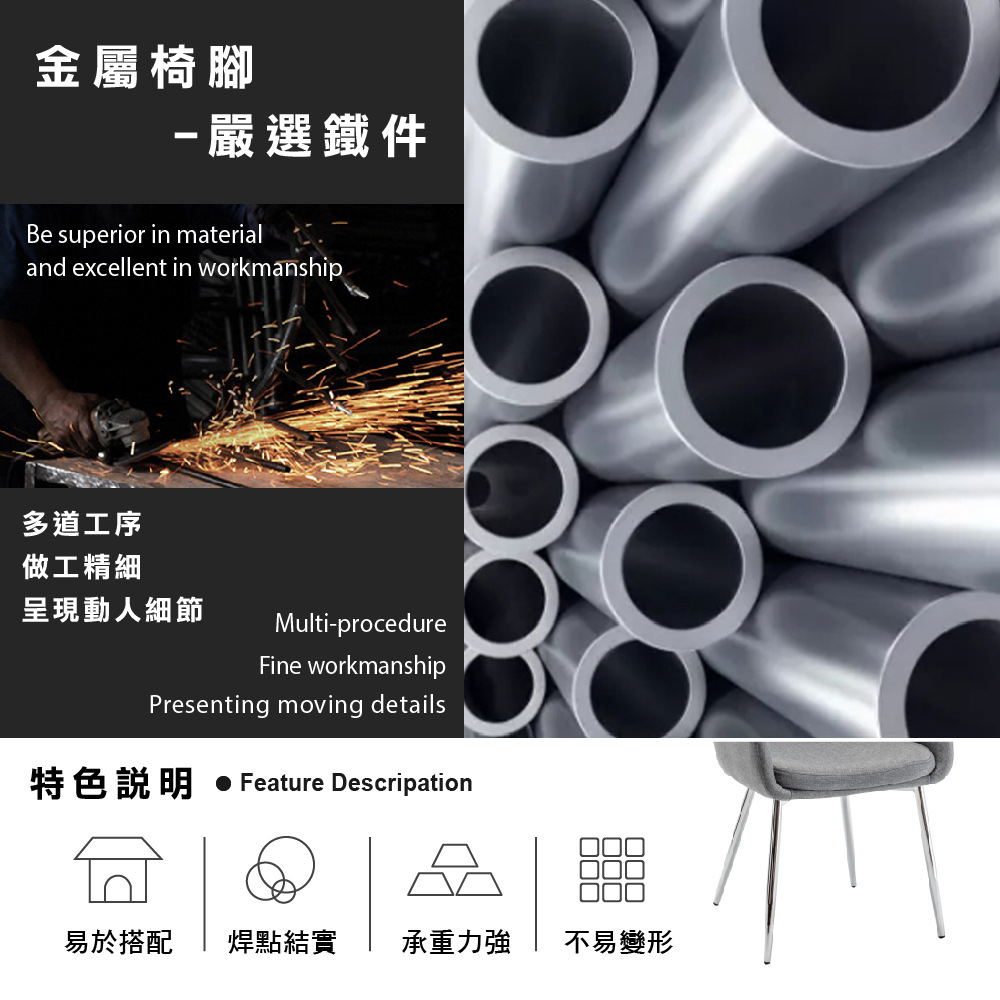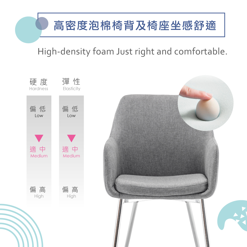 高密度泡棉椅背及椅座坐感舒適,銀色電鍍金屬椅腳、穩固又耐用,附贈防刮腳墊、耐磨並保護地板,