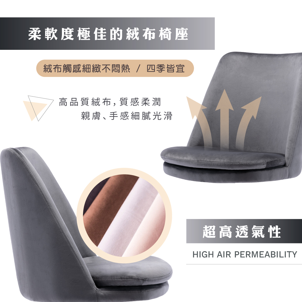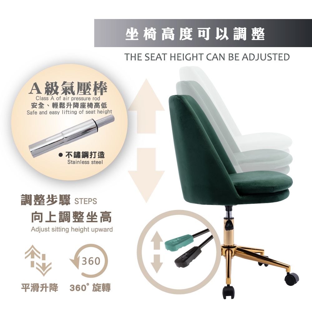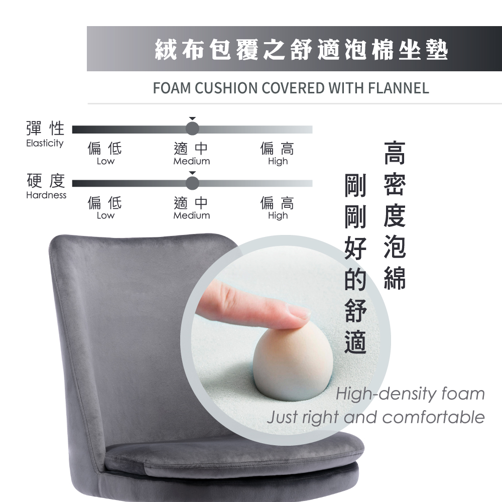 絨布觸感細緻不悶熱,四季皆宜,雙層之泡棉椅墊、提供舒適坐感,配備美規A級氣壓棒、安全升降,