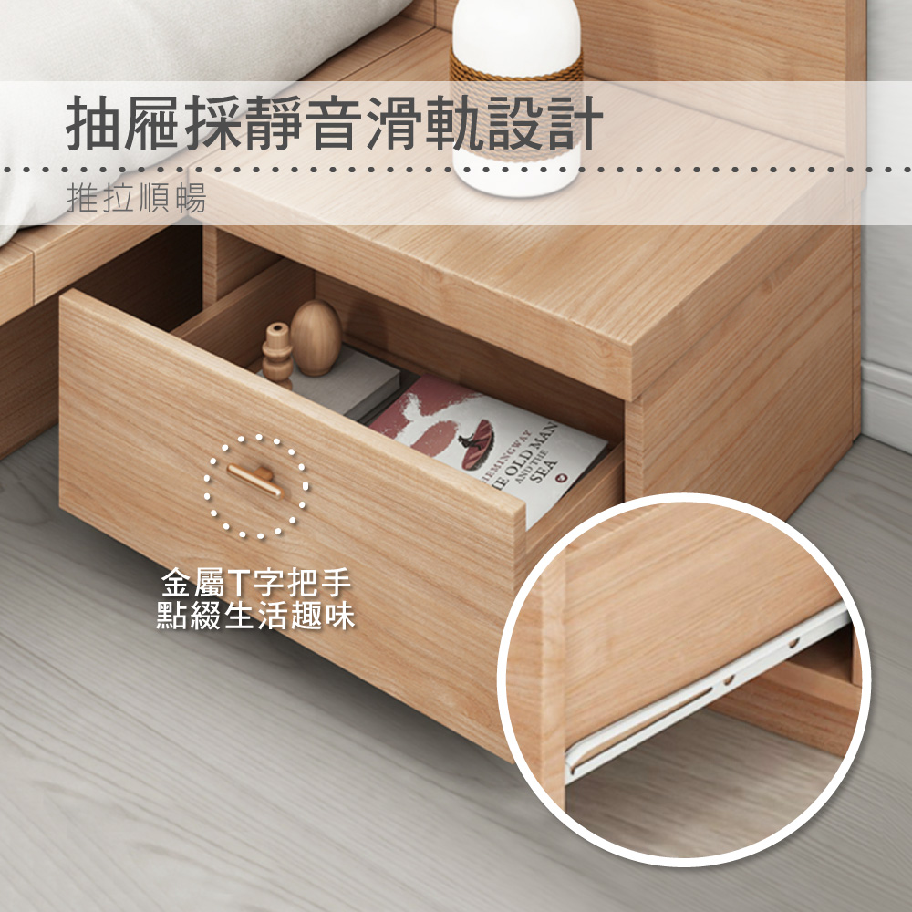 寬大桌面睡前可擺放手機或書籍,金屬T字抽屜把手點綴生活趣味,抽屜採靜音滑軌設計,推拉順暢,