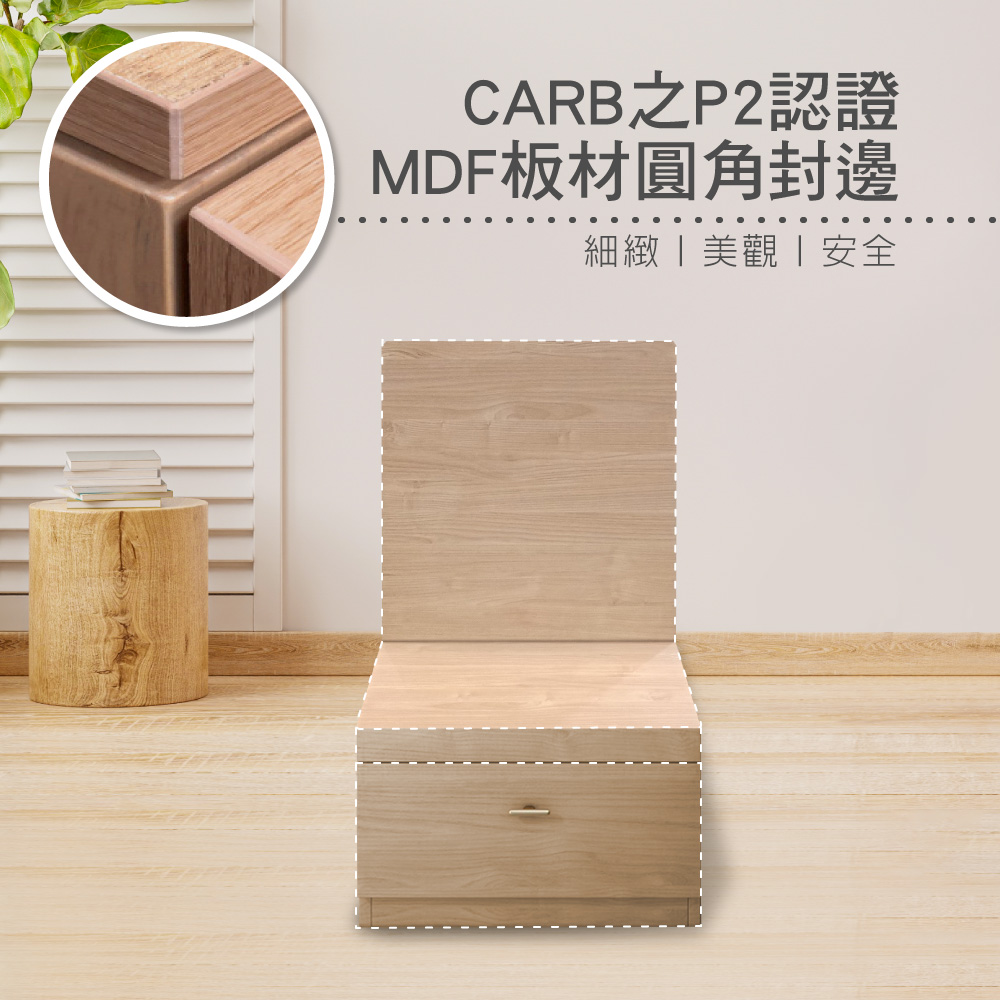 台灣與歐美同步販售、美規設計,CARB之P2認證MDF板材圓角封邊,防潑水PVC木紋皮包覆MDF板材,