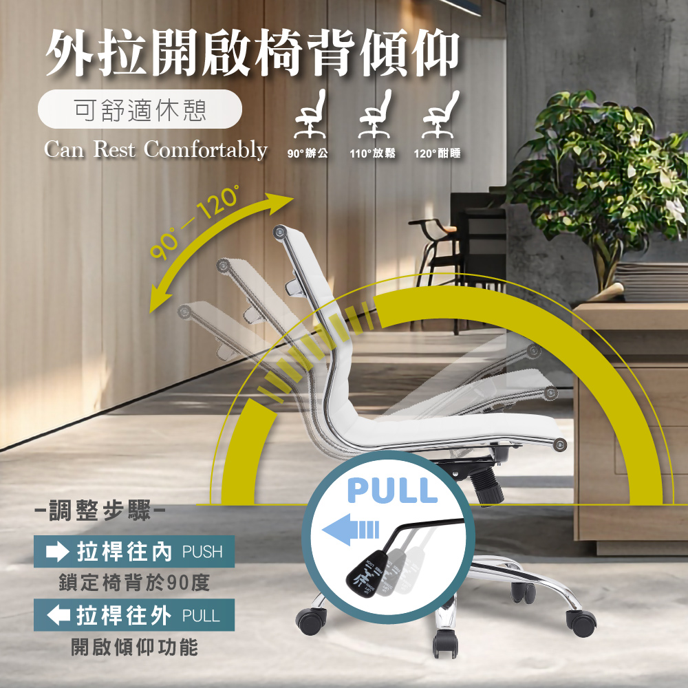 電鍍金屬曲線椅框,背部好倚靠,外拉開啟椅背傾仰,可舒適休憩,配備美規A級氣壓棒、安全升降,