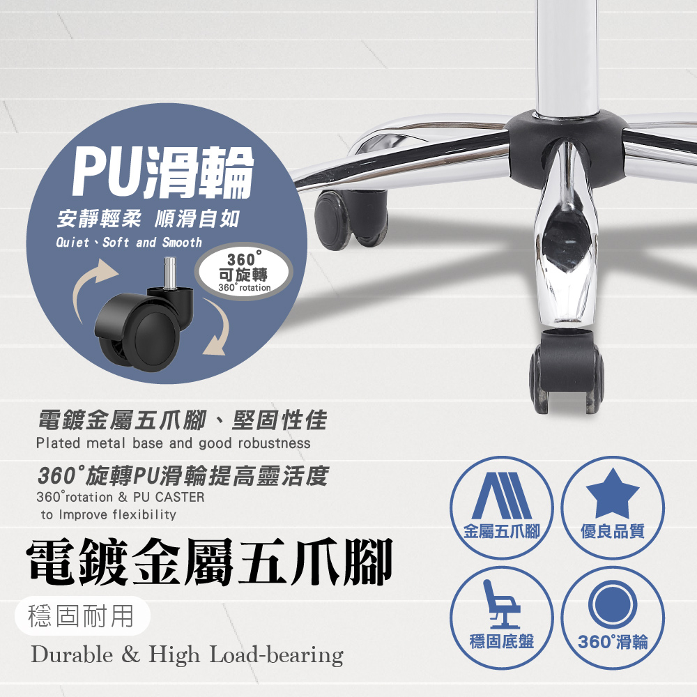 採用電鍍金屬五爪腳,穩固耐用,360°旋轉靜音P.U.滑輪靈活移動,成為您辦公及商務會議的最佳夥伴。