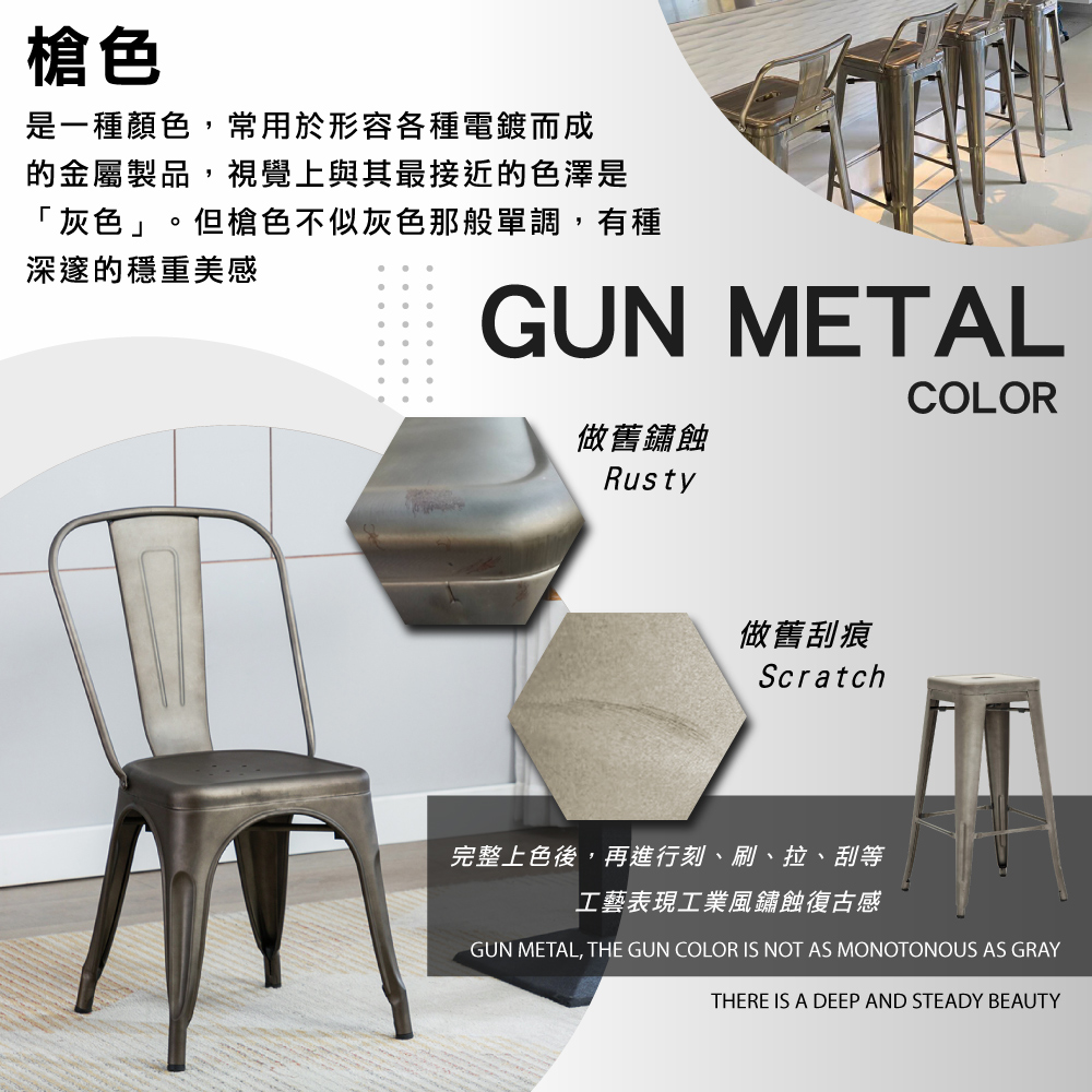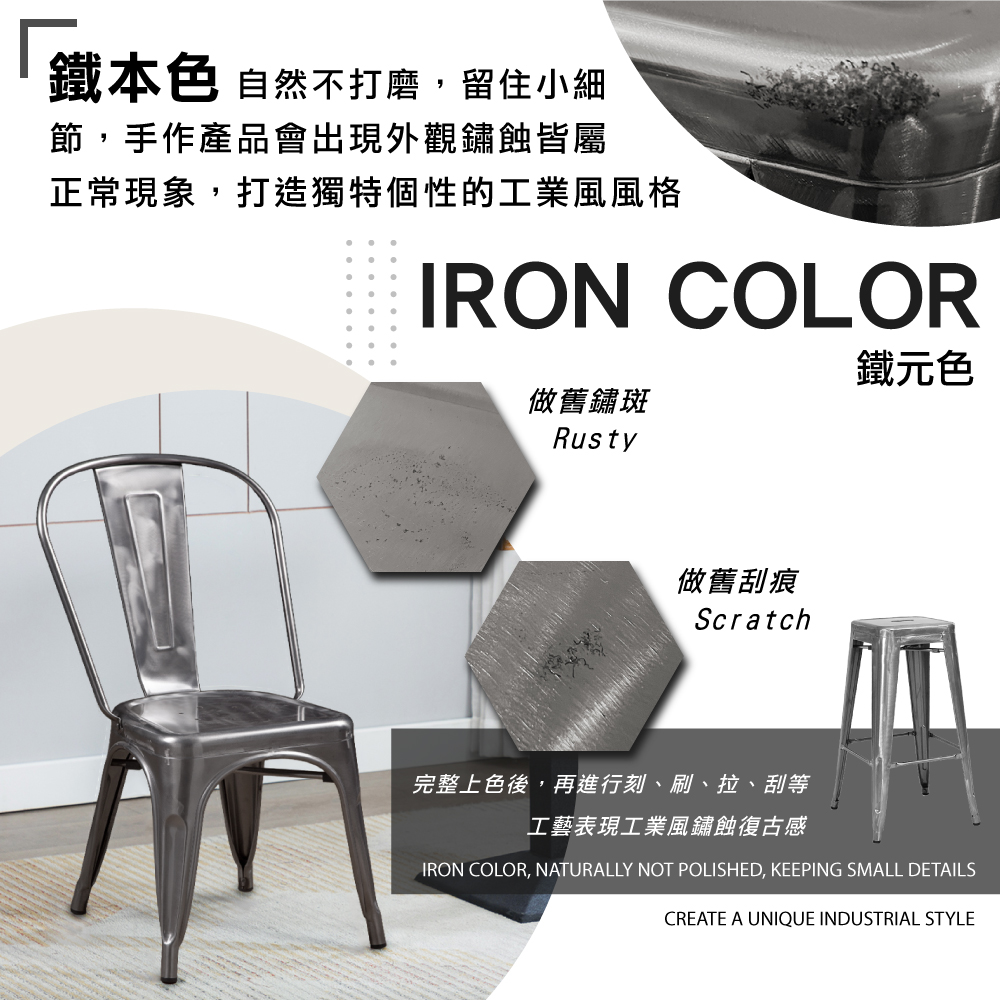 堅固金屬結構室內和室外皆適用,配有塑膠的腳墊、貼心不傷地板,工業風搭配與各式空間完美契合,