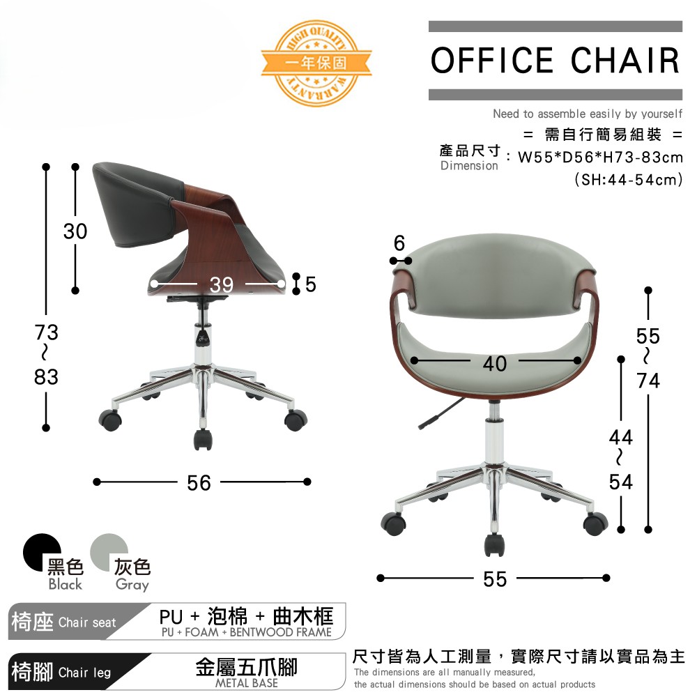 材質:PU皮 + 泡棉 + 曲木框 + 金屬五爪腳 + 尼龍輪