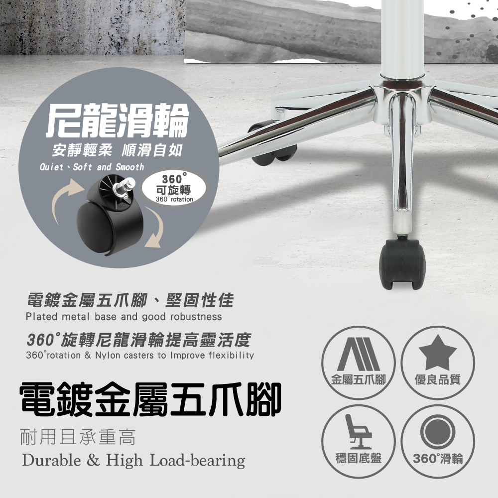 配備美規A級氣壓棒、安全升降,電鍍金屬五爪腳、耐用且承重高,360°旋轉尼龍輪,使用靈活機動,