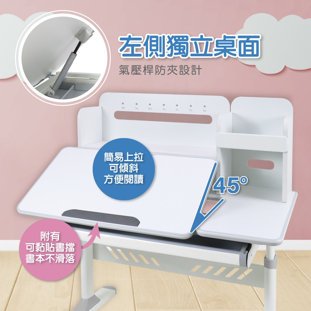 簡易上拉可以傾斜45度方便閱讀,桌沿貼心設計圓弧包邊防撞膠條,桌面附有可黏貼書擋書本不滑落,