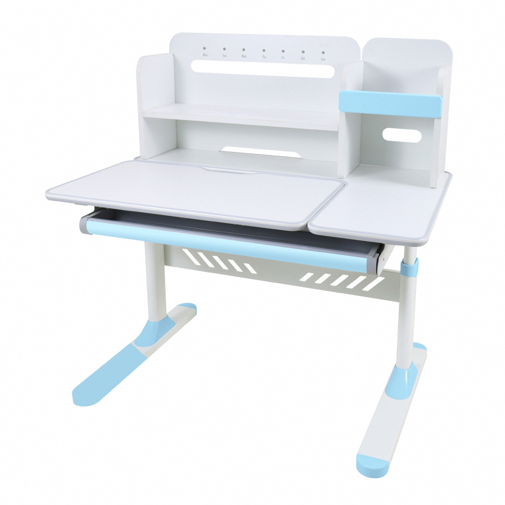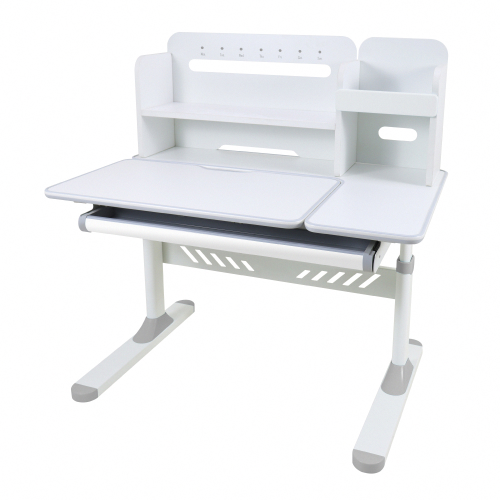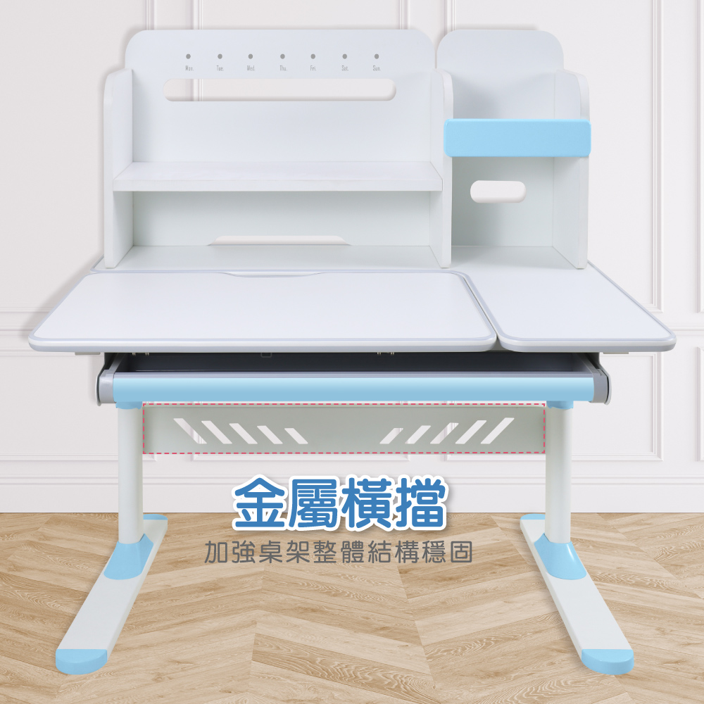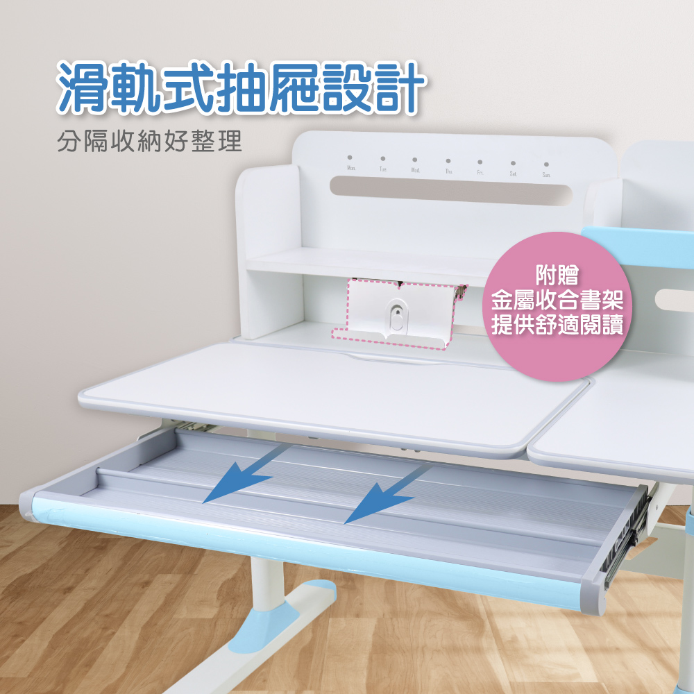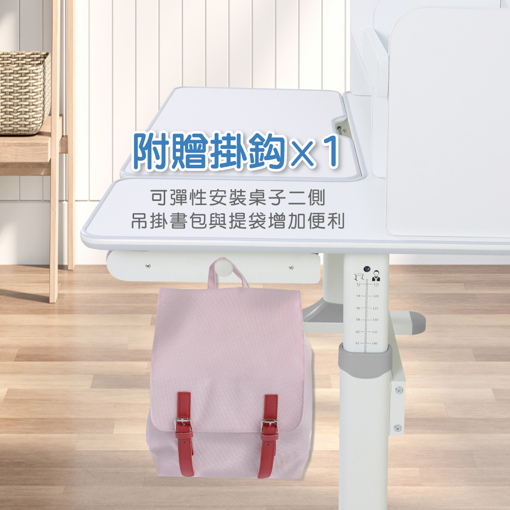右側獨立桌面空間可供家長伴讀,滑軌式抽屜設計分隔收納好整理,附一個掛勾可彈性安裝桌子二側,