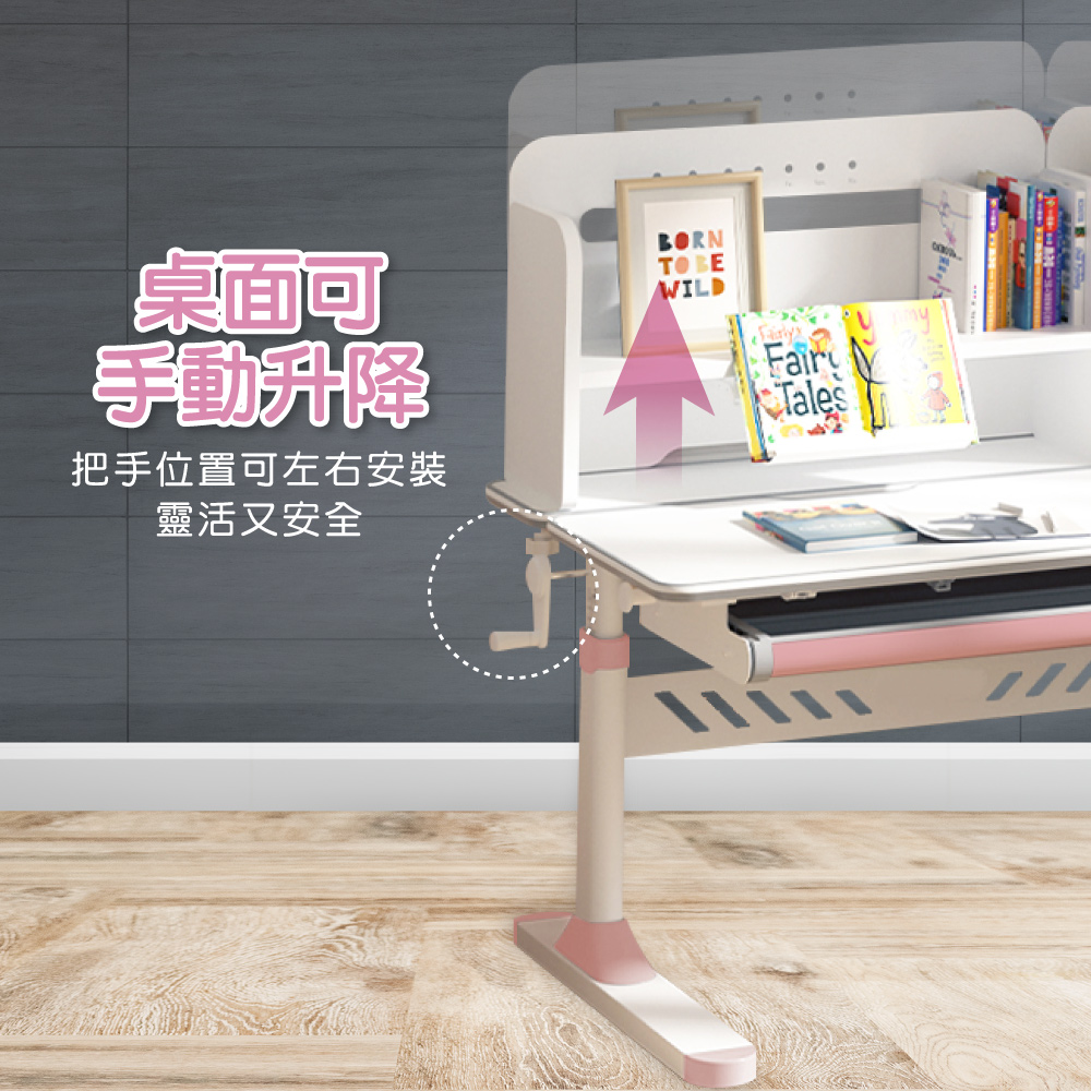 多功能吊掛書包與提袋增加便利,手動式把手,旋轉控制桌面升降,手把位置可左右安裝靈活又安全,
