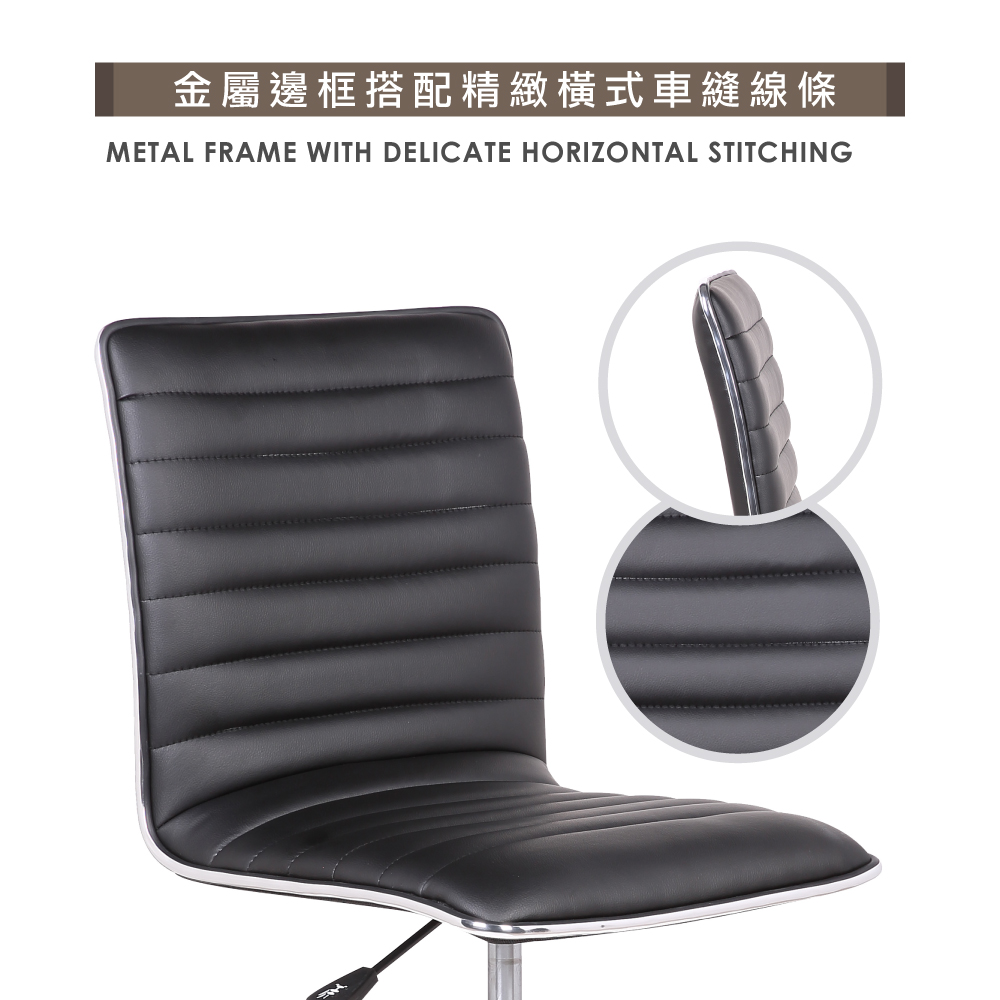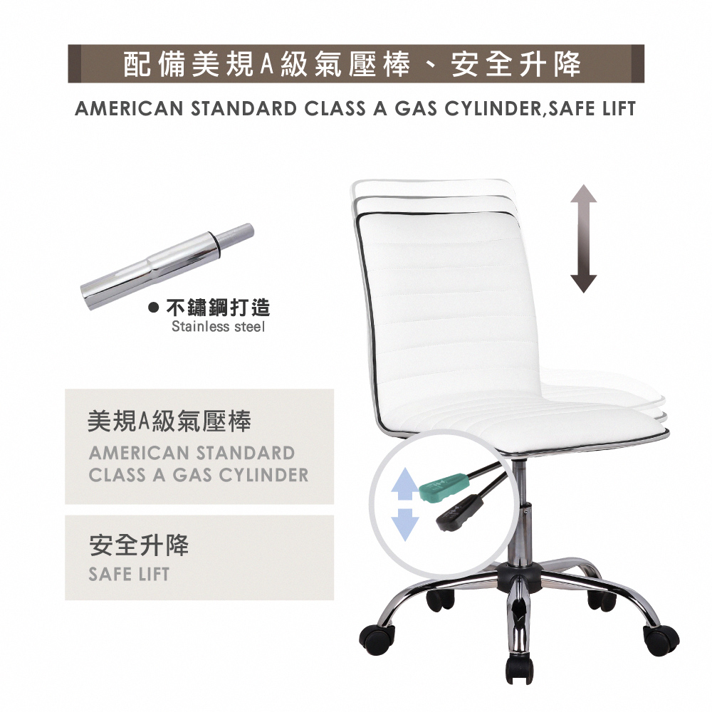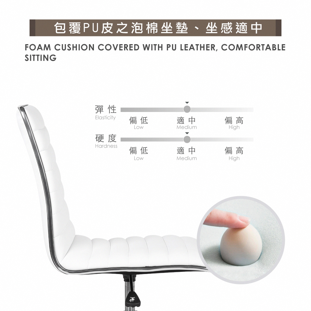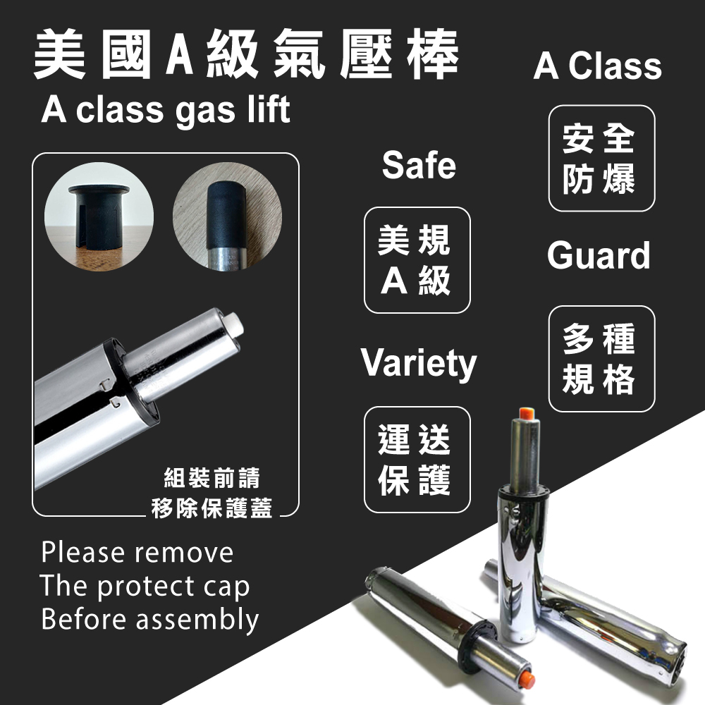 包覆PU皮之泡棉坐墊、坐感適中,配備美規A級氣壓棒、安全升降,電鍍金屬五爪腳、耐用且承重高,