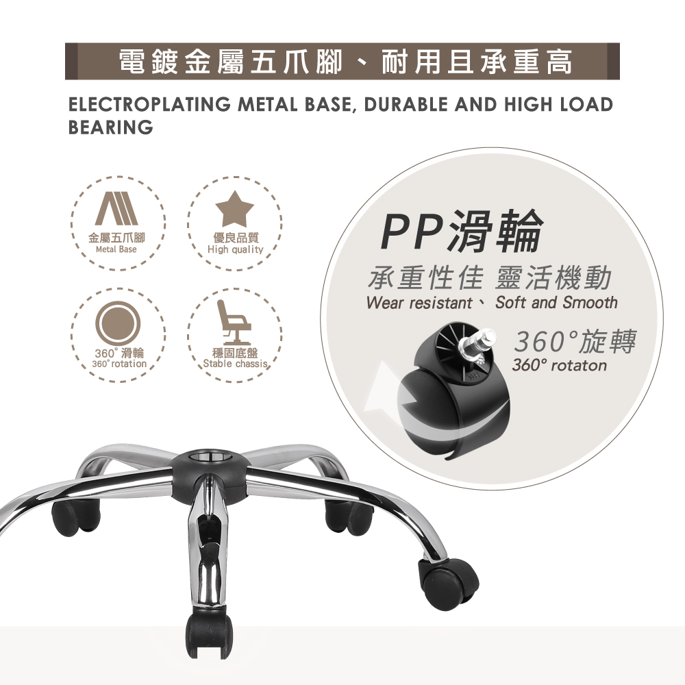 材質:PU皮+電鍍五爪腳+PP滑輪