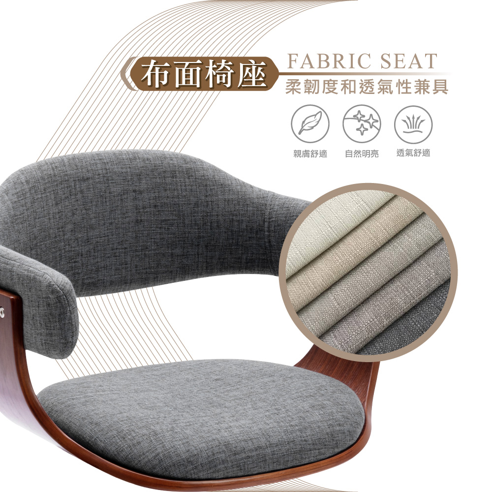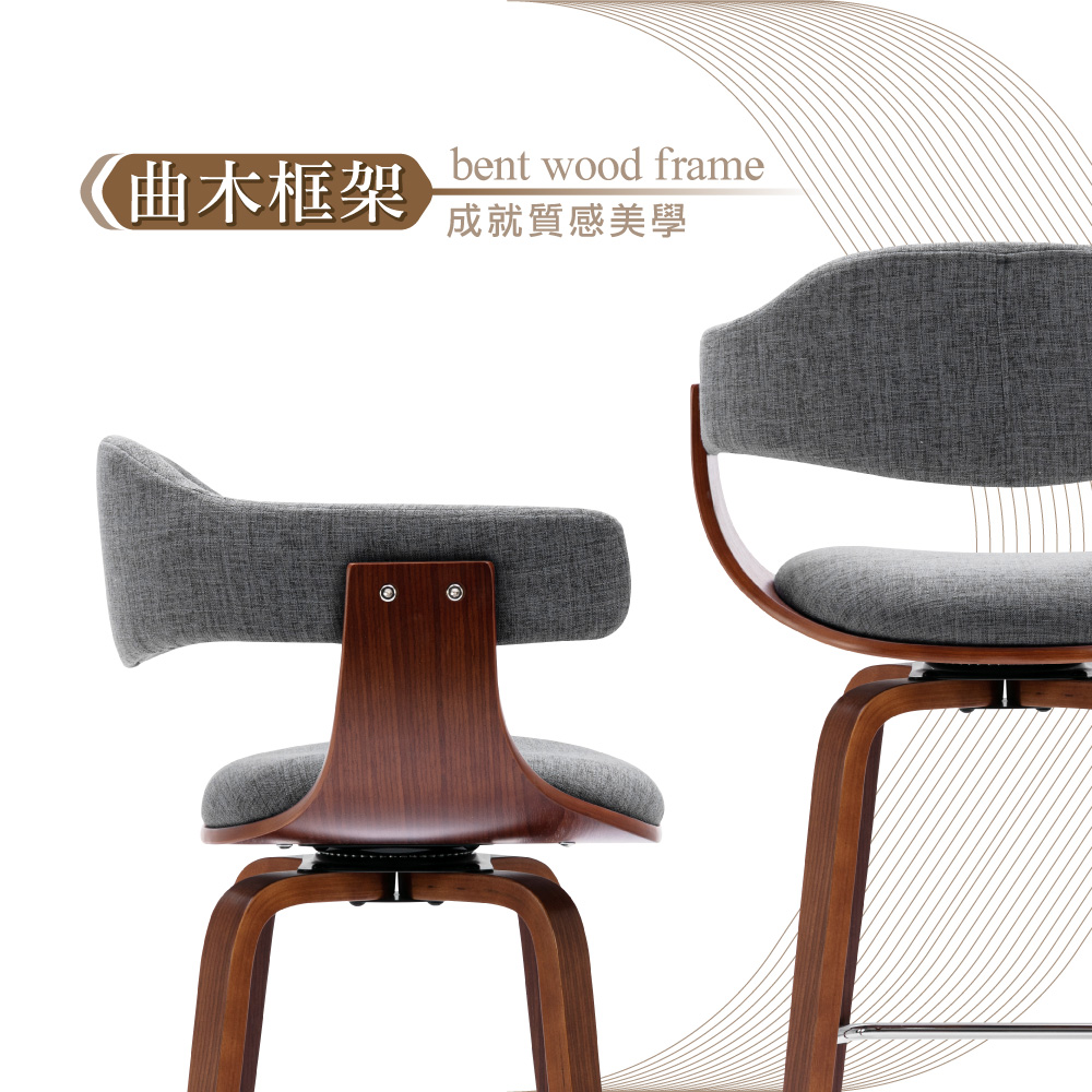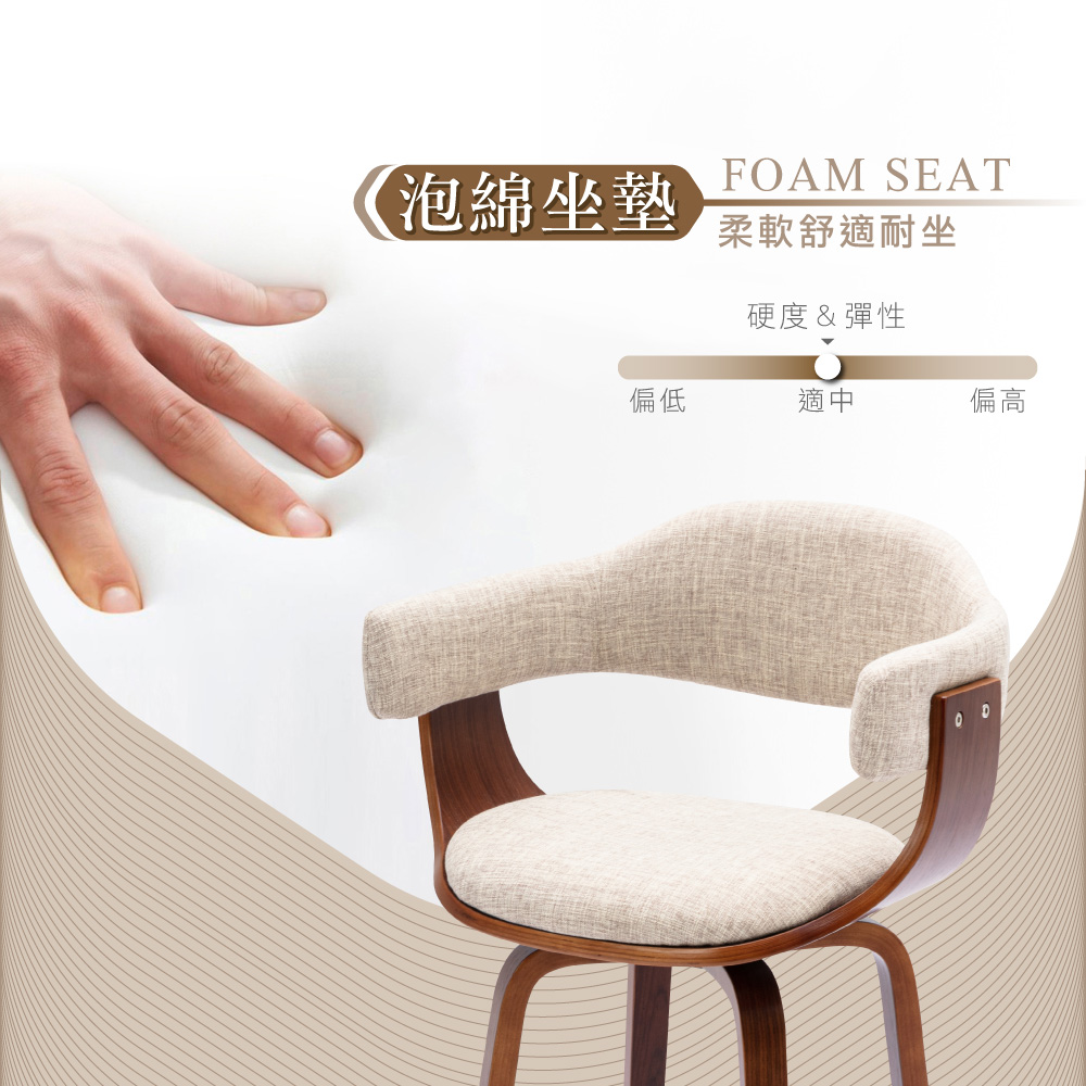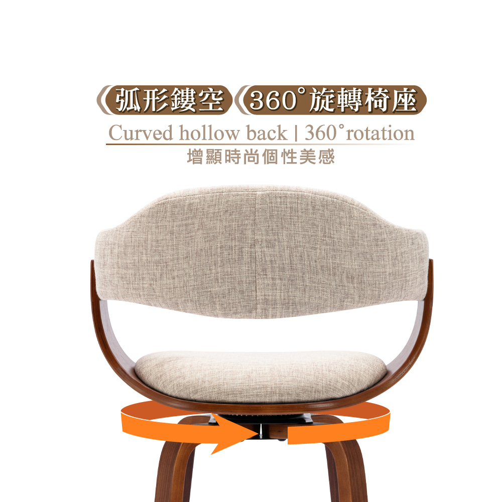搭配泡棉坐墊、提供支撐坐感佳,獨特曲木椅座框架成就質感美學,椅座可360°旋轉方向隨意彈性佳,