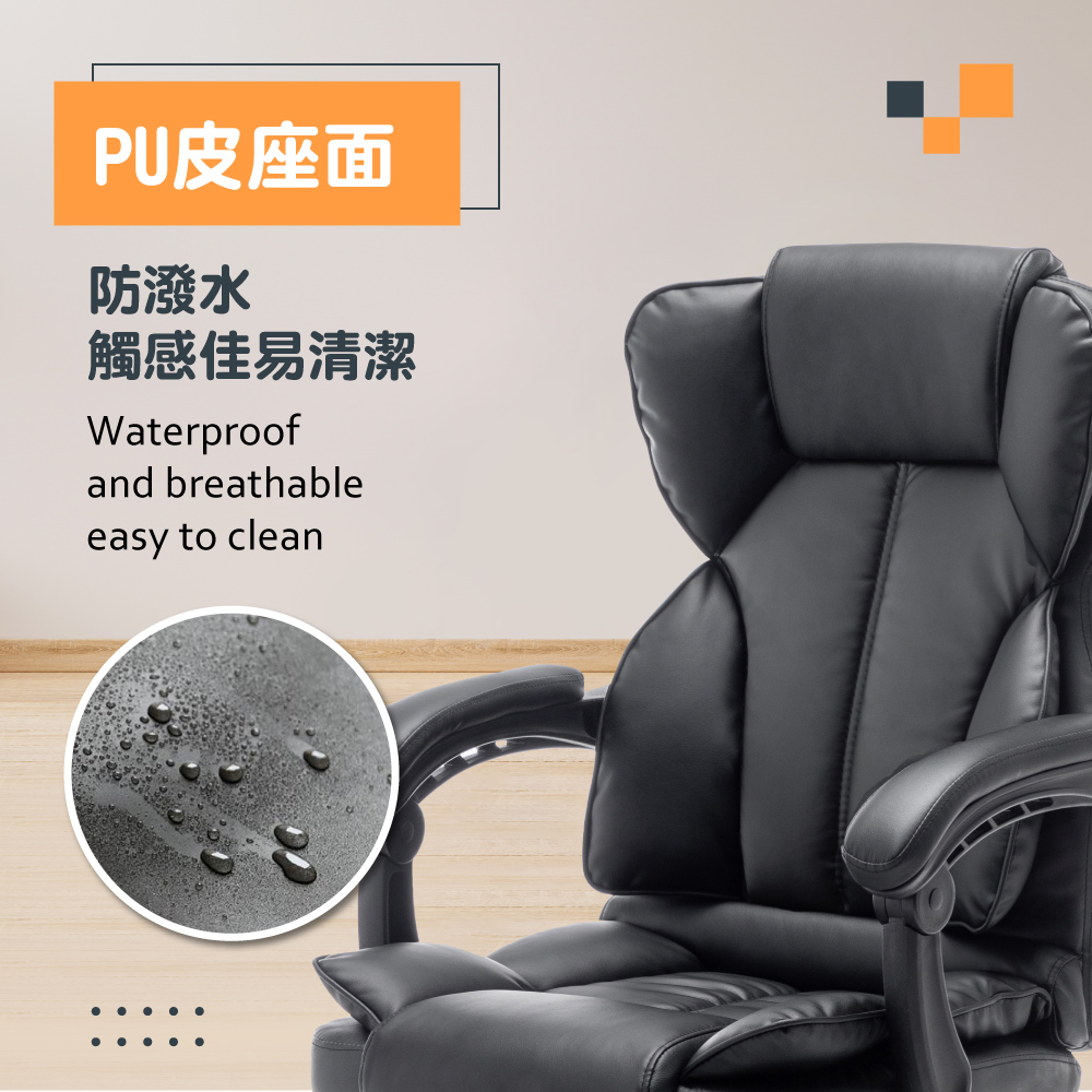 台灣與歐美同步販售、美規設計,防潑水PU皮座面,觸感佳易清潔,特殊三面立體頭枕柔軟承托頭頸,